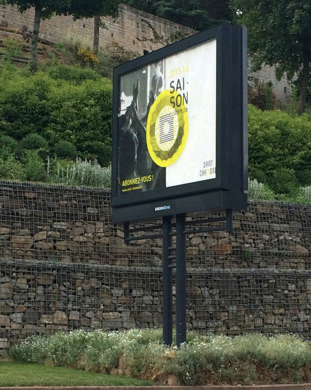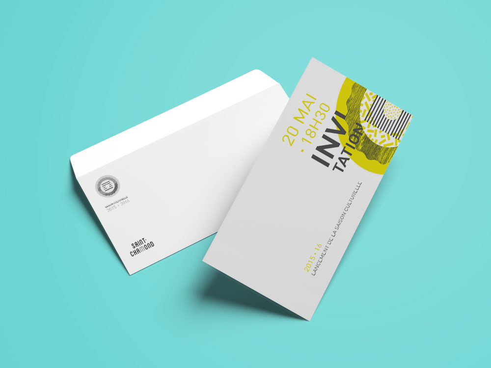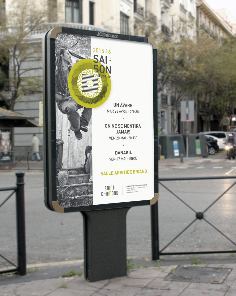 La ville de Saint-Chamond souhaite promouvoir sa saison culturelle 2015-16 et informer le public de la programmation à venir. Création de l’identité de saison en résonance avec la nouvelle identité visuelle de la ville. Mise en œuvre de la communication 360° (supports imprimés et digitaux, habillage de bâtiments, etc.).